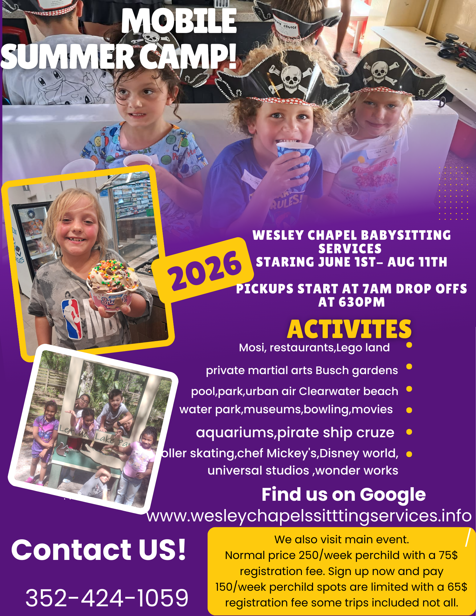 Well, pick them up at your very own doorstep and also drop them off. Our mobile camps visits places such as the park, pools, Disney, universal, pirate ship cruses, free martial arts, Urban air, Busch gardens, sports and games, Restaurants kayaking Dave & Buster's the biggest world McDonald's MOSI, clear water beach pools a 4 night overnight stay in a Disney house with a pool and hot tub in July 13th through 17th 2026 the vacation home address can be requested and will be given to the parent's. Orlando, science museums adventure island so much more FUN!